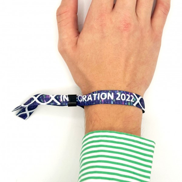 Bracelet textile personnalisé en sublimation, idéal pour les visuels complexes, multicolores ou avec dégradés. Il permet une personnalisation sans limite de couleurs, tout en offrant un bracelet confortable et inviolable.