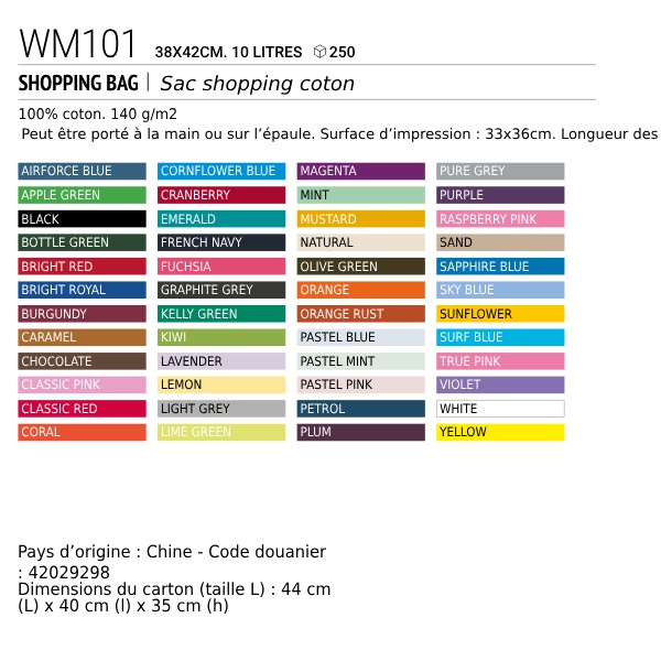 • Peut être porté à la main ou sur l’épaule. Surface d’impression : 33x36cm. Longueur des anses : 67cm.